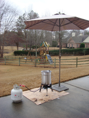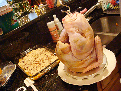 今年はターキーをフライヤーで揚げようということになって男性陣がわいわいと取り組んでいました。ターキーやプライムリブ、肉関係は男の仕事、サイドやデザートは女性が係りというのが我が家のスタイルです。アメリカでは一般的にこういう家庭が多いのかもしれません。あいにくの雨でしたがアウトドアテーブルの傘でなんとか凌いだみたいです。オーブンのターキーよりジューシーで、ケイジャン風のスパイスもおいしくてなかなかのお味でしたけど・・準備に時間もかかったし、揚げ油だけで$50もかかったし、さて来年も登場しますやら?画像ちょっとグロテスクでごめんなさい(特にベジタリアンの方)。隣に見えるのはスイートポテトキャセロールです。この他グリーンビーンキャセロールやアスパラガスディッシュ等、我が家の定番が並びました。セッティングしてからは忙しくて、お料理の写真撮り忘れてしまいました(泣)