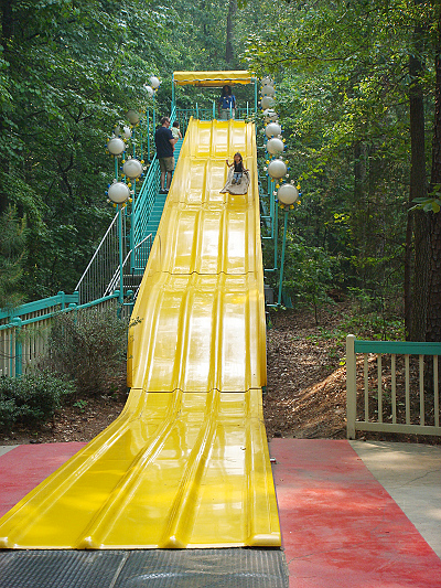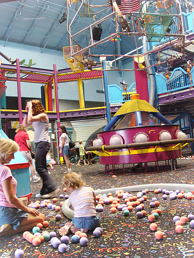 週末には隣町にある遊園地SixFlagの子供バージョン、American Adventureというところに行ってきました。本当にうちの子は行きたいところに毎週末連れて行ってもらえすぎ!すべてダンナ君が決めているんですけどね。甘やかしすぎるのもなぁと思うけど彼も嬉しそうだし、なかなか「それやだーモール行きたい!」とは言いにくいですね・・とかいいつつだいたい翌日にはわたしの希望が叶いますが(笑) 3歳までは大人と同じ$6だったのに3歳超えたら$16といきなり高くなってビックリ。すべて乗り放題ですが半分ほど大人が同伴できない小さいものもありです。こんな高い滑り台、麻袋を敷いて一気にすべるのですがこんなのもチェルは一人でへっちゃら、本当頼もしい娘です。乗り物に疲れたら室内にも楽しい遊び場があります。フォーム製の軽いボールが何万とあるボールルーム。大人も思わず楽しめちゃう嗜好がたくさん。