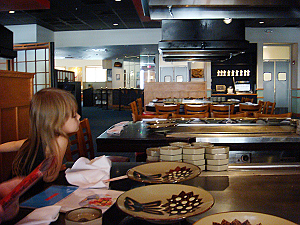 かなり前ですが家族で久しぶりに紅花(鉄板ステーキで有名なチェーン店)にいきました。おじちゃんが目の前でアクロバットな包丁やヘラさばきを披露してくれるお店なのでダンナ君が1度チェルに見せてあげたかったみたい。海老の尻尾を帽子の中にポイポイ投げていく所では少し受けてたけど大して感動してくれず、「おじちゃん、うるさーい」なんて言ってました。私はステーキの他にもお寿司やらカクテルやら頼んでいたらかなり合計がすごい金額になり二人でビックリ。まぁエンターテイメント代だと思って我慢しましょー(もう来ないぞーー!)